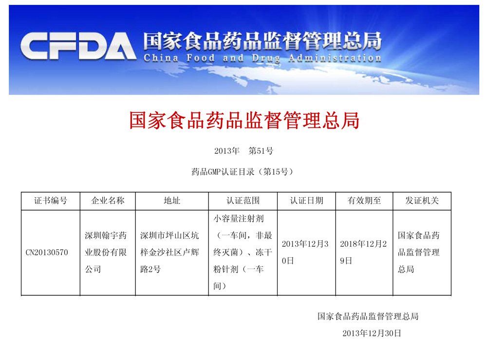 国家食品药品监督管理总局于2013年12月30日发布公告, 按照《药品生产质量管理规范认证管理办法》的规定,经现场检查和审核批准,深圳尊龙凯时-人生就是搏药业股份有限公司等42家药品生产企业符合《药品生产质量管理规范(2010年修订)》要求,发给《药品GMP证书》。